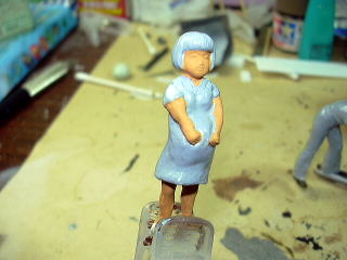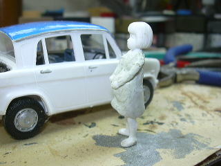 男性フィギュアは頭を削ってそれらしくし、ズボンのすそをパテで盛りつけ。 女性はお腹をさらに盛りつけて