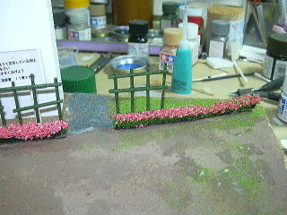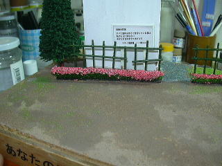 柵や樹木は昭和の歳時記のパーツから、ツツジの植え込みは河合商会の情景パーツを接着してみました。