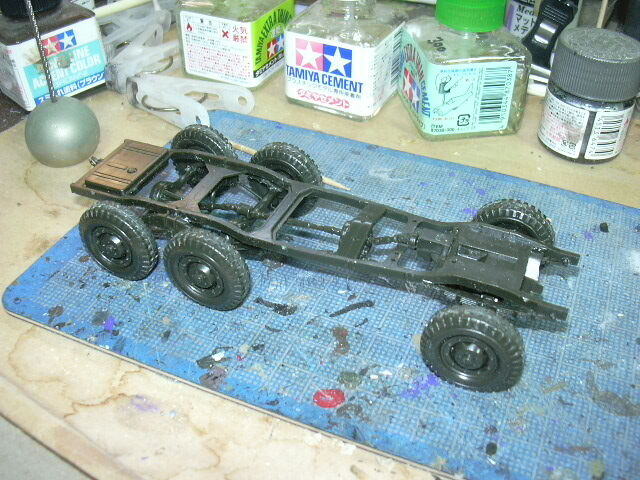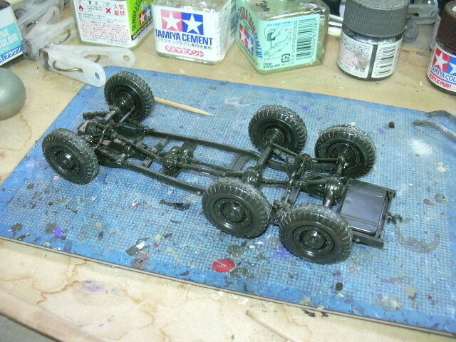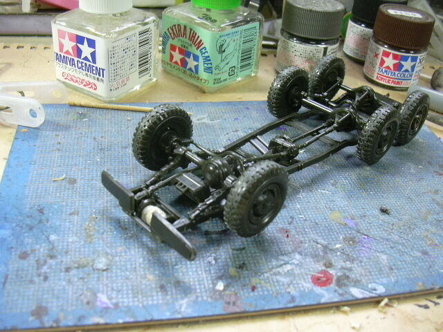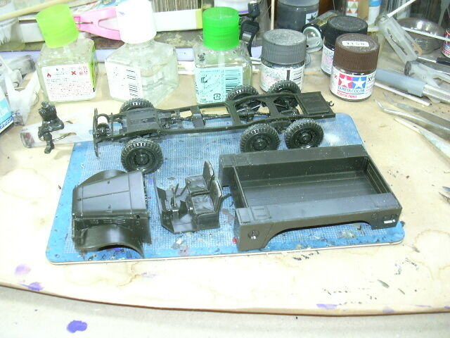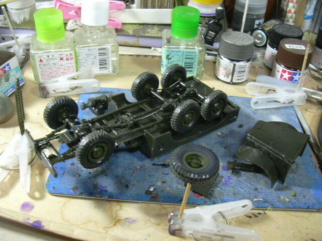 運転席と後部荷台部分を接着、タイヤや後で塗れない部分を先に塗装しておきます。