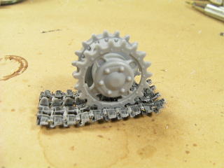 片側の履帯の連結が終わり、転輪のサスペンションの組立も行ったので、前後の駆動輪、誘導輪を仮付けして、