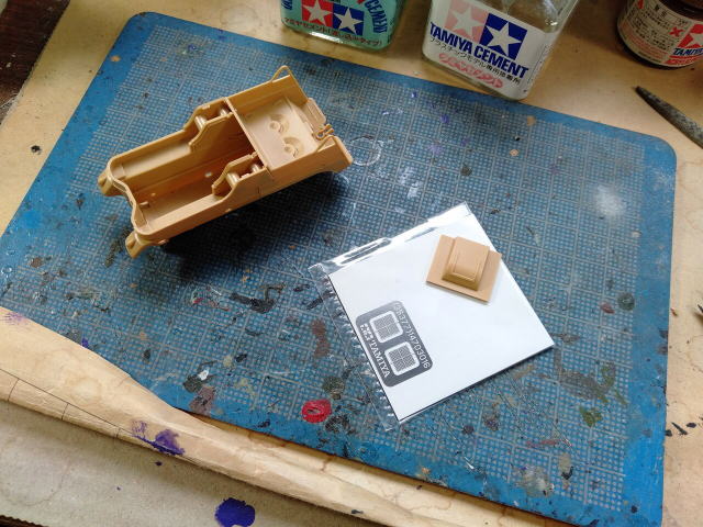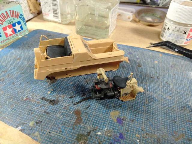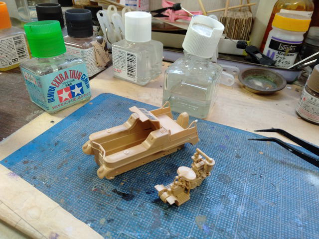 ケッテンクラート、エンジン部分の組立。塗装しながらでないと進められないのが玉に瑕。接着剤の蓋が