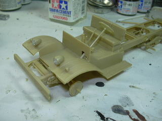 運転席周りの部品と取り付けた後、運転席をシャーシに接着します。