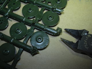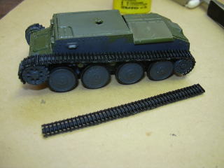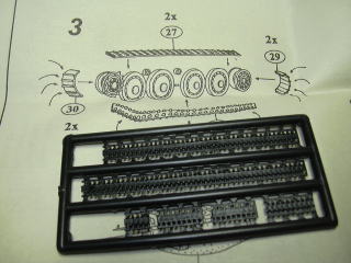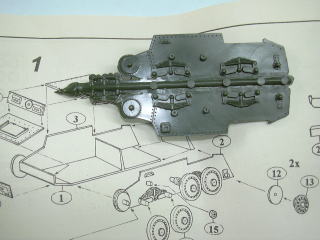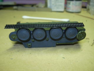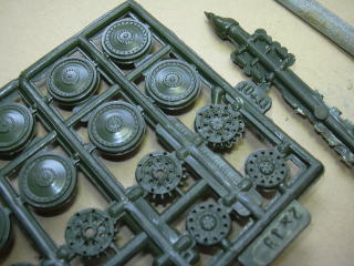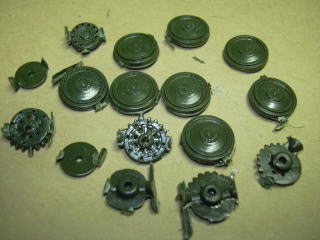 次は、転輪の組み込みと、キャタピラの取り付けですが、軟質プラ製のキャタピラは自分で適当に曲げなさい