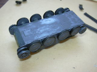 反対側の転輪なども組立て、ついでに車体下部などを塗装しておきます。