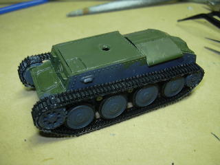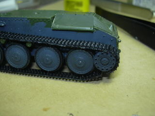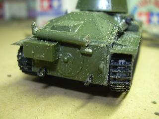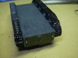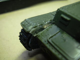 リターンローラ(上部転輪)も部品をなくさないうちに接着しておきました。(右の写真:車体前部上から撮す)